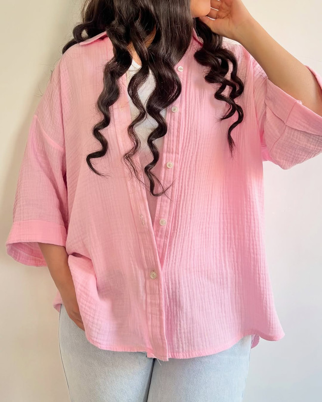 شومیز موسلین صورتی پودری با جنس موسلین وارداتی درجه یک در سایز فری تا ۴۶.